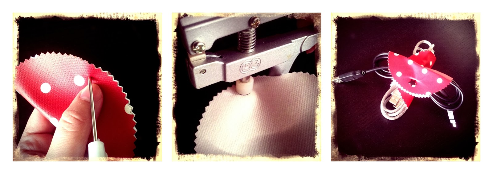 Den Wachstuchkreis in der Hälfte falten und mit der Ahle vorlochen … Kam Snap einsetzen und festdrücken … und fertig ist der Cord Taco – der stylische Kabelbinder …